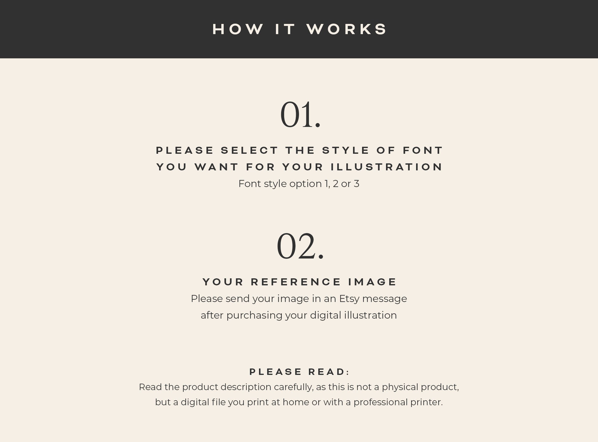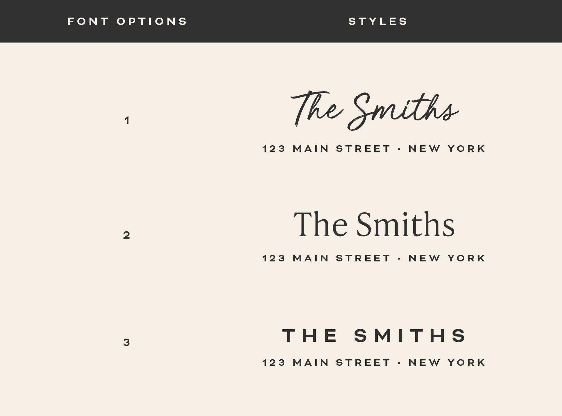 2. Specify the Font Style you want the name and address displayed in (1, 2 or 3) and send me a clear photo of the home at hello@alisawismer.com